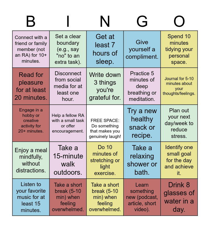 This bingo card has a free space and 24 words: Take a 15-minute walk outdoors., Take a short break (5-10 min) when feeling overwhelmed., Write down 3 things you're grateful for., Listen to your favorite music for at least 15 minutes., Spend 10 minutes tidying your personal space., Connect with a friend or family member (not an RA) for 10+ minutes., Read for pleasure for at least 20 minutes., Set a clear boundary (e.g., say "no" to an extra task)., Try a new healthy snack or recipe., Do 10 minutes of stretching or light exercise., Practice 5 minutes of deep breathing or meditation., Engage in a hobby or creative activity for 20+ minutes., Take a relaxing shower or bath., Identify one small goal for the day and achieve it., Disconnect from social media for at least one hour., Learn something new (podcast, article, short video)., Plan out your next day/week to reduce stress., Get at least 7 hours of sleep., Journal for 5-10 minutes about your thoughts/feelings., Help a fellow RA with a small task or offer encouragement., Drink 8 glasses of water in a day., Enjoy a meal mindfully, without distractions., Give yourself a compliment. and Take a short break (5-10 min) when feeling overwhelmed..