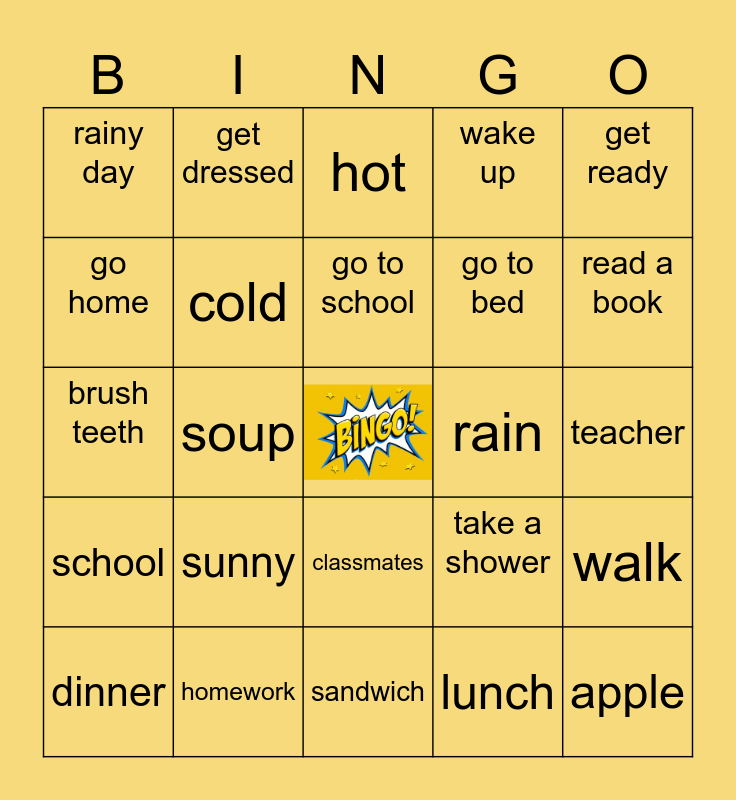 This bingo card has a free space and 29 words: dinner, coffee, soup, windy, rainy day, hot, cold, sunny, rain, homework, teacher, apple, sandwich, lunch, read a book, learn, classmates, school, get ready, brush teeth, take a shower, rest, go to bed, go home, wake up, get dressed, walk, go to school and read.