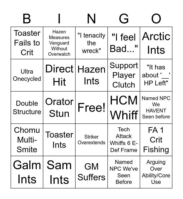 This bingo card has a free space and 24 words: Toaster Ints, Sam Ints, Hazen Ints, Galm Ints, Arctic Ints, Toaster Fails to Crit, Ultra Onecycled, Hazen Measures Vanguard Without Overwatch, HCM Whiff, Striker Overextends, Support Player Clutch, Double Structure, Tech Attack Whiffs 6 E-Def Frame, FA 1 Crit Fishing, Direct Hit, Named NPC We've Seen Before, Named NPC We HAVENT Seen before, "I tenacity the wreck", "It has about '__' HP Left", Orator Stun, Arguing Over Ability/Core Use, Chomu Multi-Smite, "I feel Bad..." and GM Suffers.