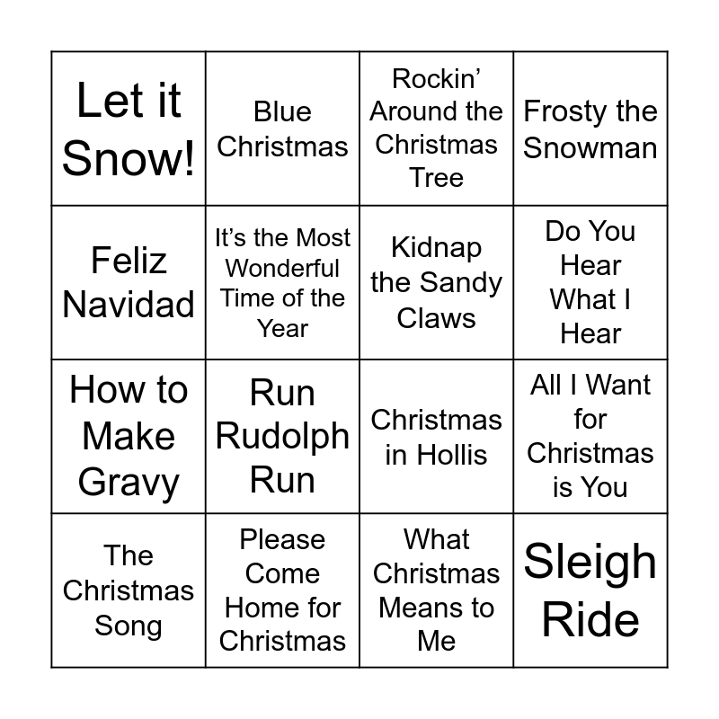 This bingo card has 20 words: All I Want for Christmas is You, Last Christmas, Rockin’ Around the Christmas Tree, Jingle Bell Rock, The Christmas Song, Feliz Navidad, Please Come Home for Christmas, Let it Snow!, How to Make Gravy, Blue Christmas, Run Rudolph Run, Christmas in Hollis, It’s the Most Wonderful Time of the Year, Sleigh Ride, Kidnap the Sandy Claws, Underneath the Tree, Do You Hear What I Hear, Frosty the Snowman, What Christmas Means to Me and Rudolph the Red Nosed Reindeer.