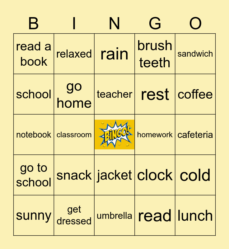 This bingo card has a free space and 60 words: wake up, get dressed, walk, go to school, read, play, go home, go to bed, rest, take a shower, brush teeth, get ready, school, classmates, learn, read a book, lunch, sandwich, apple, teacher, homework, rain, sunny, cold, hot, rainy day, windy, soup, coffee, dinner, tired, happy, excited, bored, relaxed, breakfast, water, classroom, pencil, notebook, backpack, snack, cafeteria, blackboard, clock, desk, chair, shoes, socks, jacket, umbrella, sunshine, cloud, storm, windy day, storybook, chocolate, orange juice, banana and cookies.