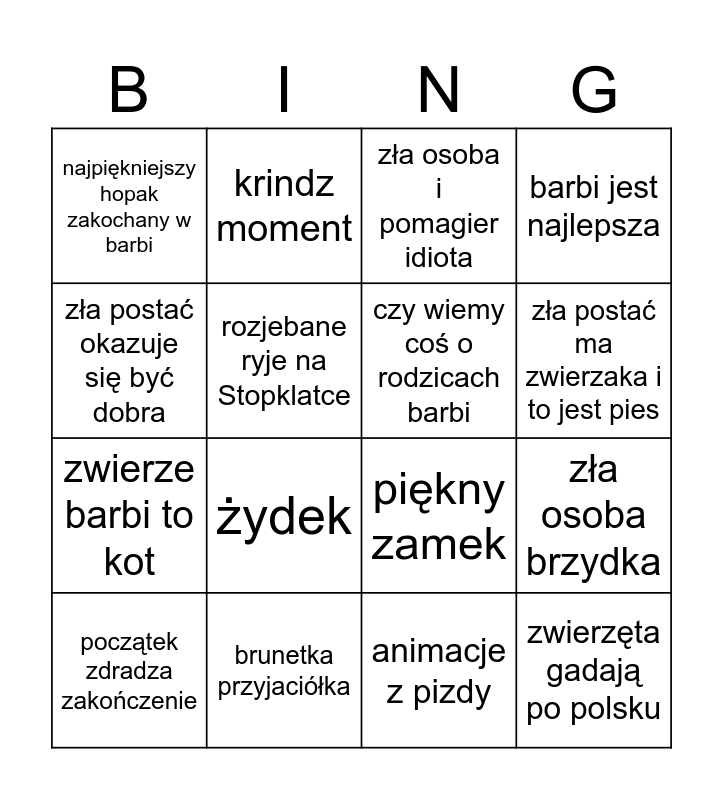 This bingo card has 16 words: brunetka przyjaciółka, zła osoba brzydka, zła osoba i pomagier idiota, najpiękniejszy hopak zakochany w barbi, zwierze barbi to kot, krindz moment, piękny zamek, animacje z pizdy, zła postać okazuje się być dobra, rozjebane ryje na Stopklatce, początek zdradza zakończenie, barbi jest najlepsza, żydek, zła postać ma zwierzaka i to jest pies, czy wiemy coś o rodzicach barbi and zwierzęta gadają po polsku.