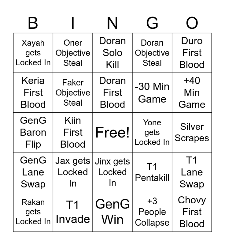 This bingo card has a free space and 75 words: Faker Solo Kill, Oner Solo Kill, Doran Solo Kill, Keria Solo Kill, Gumayusi Solo Kill, Kiin Solo Kill, Canyon Solo Kill, Chovy Solo Kill, Ruler Solo Kill, Duro Solo Kill, Faker First Blood, Oner First Blood, Doran First Blood, Keria First Blood, Gumayusi First Blood, Kiin First Blood, Canyon First Blood, Chovy First Blood, Ruler First Blood, Duro First Blood, T1 Baron Flip, GenG Baron Flip, Faker Objective Steal, Oner Objective Steal, Doran Objective Steal, Keria Objective Steal, Gumayusi Objective Steal, Kiin Objective Steal, Canyon Objective Steal, Chovy Objective Steal, Ruler Objective Steal, Duro Objective Steal, GenG Pentakill, T1 Pentakill, +40 Min Game, -30 Min Game, T1 Reverse Sweep, GenG Reverse Sweep, Silver Scrapes, +3 People Collapse, Aurora gets Locked In, Azir gets Locked In, Varus gets Locked In, Taliyah gets Locked In, Pantheon gets Locked In, Gwen gets Locked In, Rakan gets Locked In, Xayah gets Locked In, Rumble gets Locked In, Nocturne gets Locked In, Lee Sin gets Locked In, Jinx gets Locked In, Bard gets Locked In, Ezreal gets Locked In, Lucian gets Locked In, Braum gets Locked In, Annie gets Locked In, Nautilus gets Locked In, Kai’sa gets Locked In, Wukong gets Locked In, Jax gets Locked In, Skarner gets Locked In, Sylas gets Locked In, Senna gets Locked In, Tahm Kench gets Locked In, Yone gets Locked In, Viktor gets Locked In, Akali gets Locked In, Hwei gets Locked In, T1 Lane Swap, GenG Lane Swap, T1 Invade, GenG Invade, GenG Win and T1 Win.