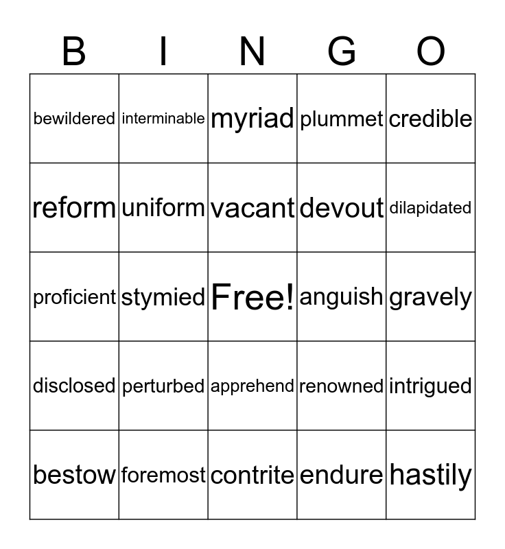 This bingo card has a free space and 24 words: perturbed, foremost, vacant, bestow, credible, bewildered, reform, interminable, anguish, apprehend, devout, proficient, renowned, intrigued, uniform, endure, gravely, myriad, dilapidated, stymied, hastily, disclosed, plummet and contrite.