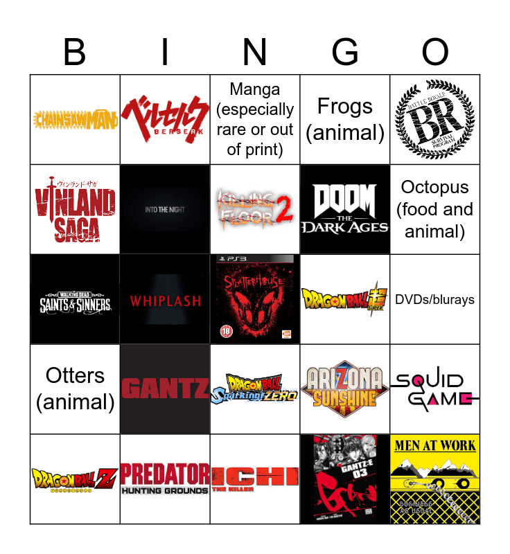 This bingo card has 20 images and 5 words: DVDs/blurays, Manga (especially rare or out of print), Octopus (food and animal), Otters (animal) and Frogs (animal).