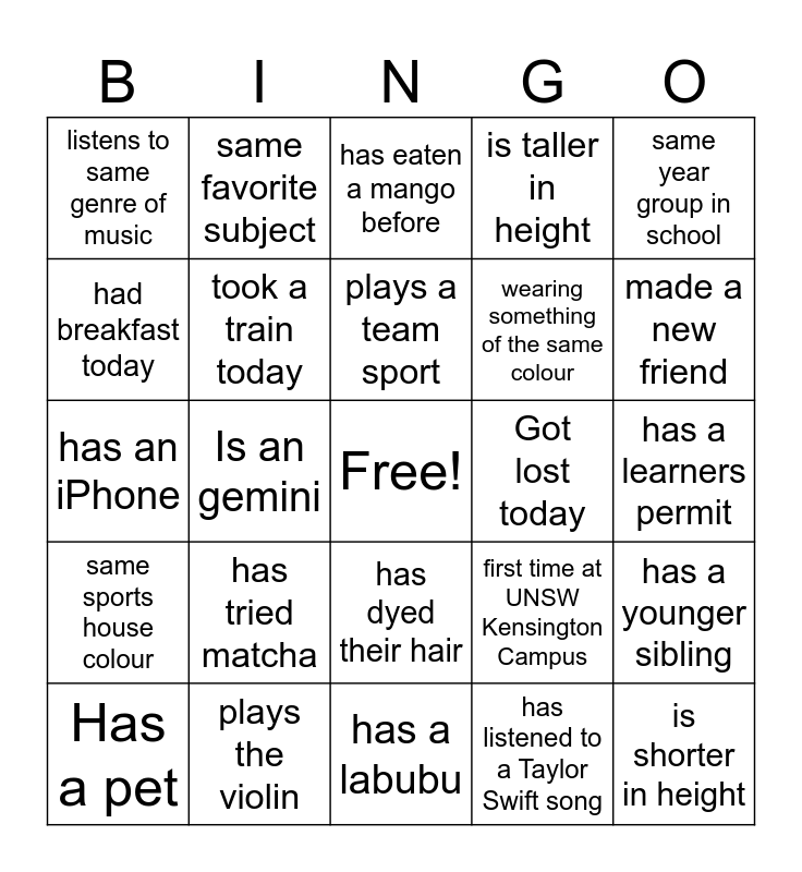 This bingo card has a free space and 29 words: Has a pet, Has the same birthday month, Is an gemini, wears glasses, listens to same genre of music, has eaten a mango before, took a train today, has tried matcha, Got lost today, plays the violin, has a learners permit, is shorter in height, has a labubu, has listened to a Taylor Swift song, made a new friend, plays video games, has dyed their hair, same sports house colour, same year group in school, has an iPhone, first time at UNSW Kensington Campus, believes pineapples should be on pizza, wearing something of the same colour, had breakfast today, is taller in height, same favorite subject, has a younger sibling, plays a team sport and has not watched Shrek (the movie).