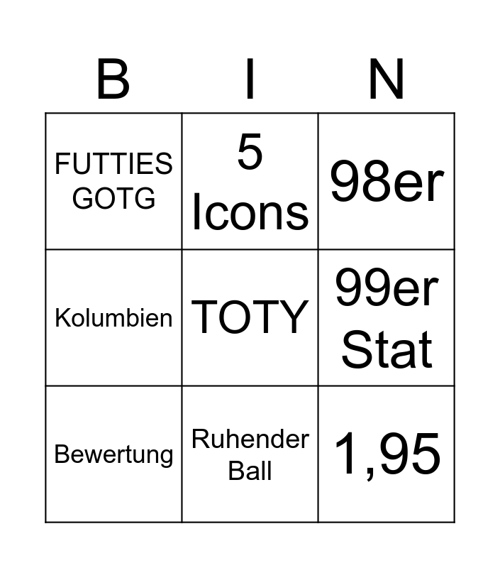 This bingo card has a free space and 8 words: 99er Stat, 98er, 5 Icons, Bewertung, FUTTIES GOTG, 1,95, Kolumbien and Ruhender Ball.