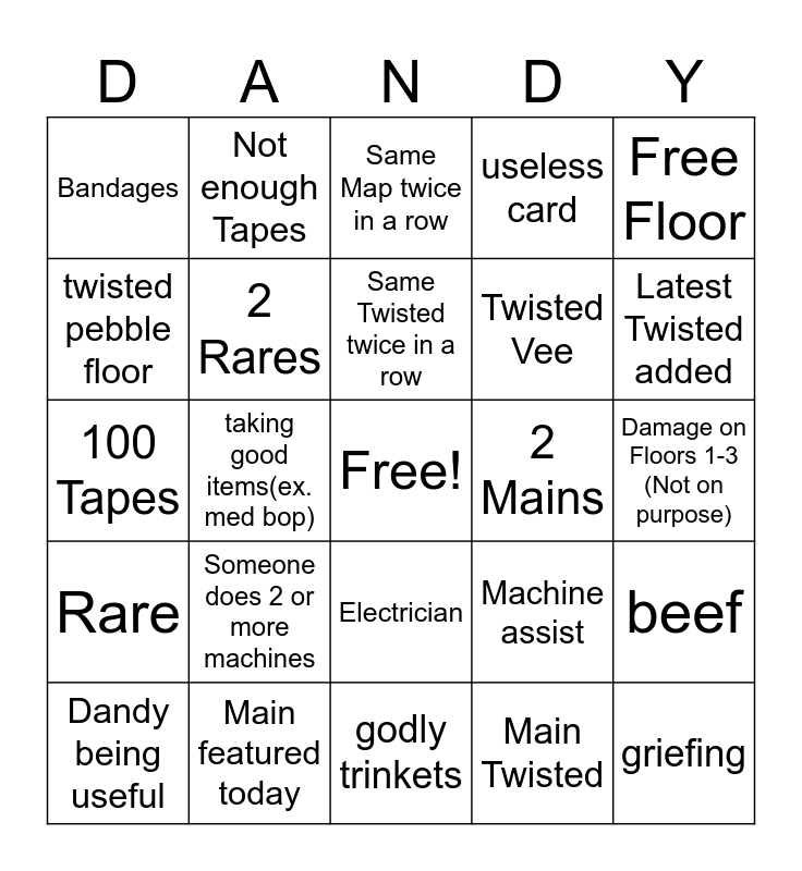 This bingo card has a free space and 34 words: 2 Commons, Main Twisted, Dandy selling useless items, Blackout, Rare, 2 Rares, Free Floor, Dandy being useful, Not enough Tapes, Screaming, Same Twisted twice in a row, Same Map twice in a row, Pizza tower be like: (Twisted version of player), Twisted/Player Shrimpo, 2 Mains, Latest Twisted added, Main featured today, 100 Tapes, Someone does 2 or more machines, Machine assist, Electrician, Rare Item, Bandages, Damage on Floors 1-3 (Not on purpose), godly trinkets, griefing, useless card, ruining pebbles distracting, Twisted Vee, twisted pebble floor, dying early floors, taking good items(ex. med bop), beef and annoying persom.