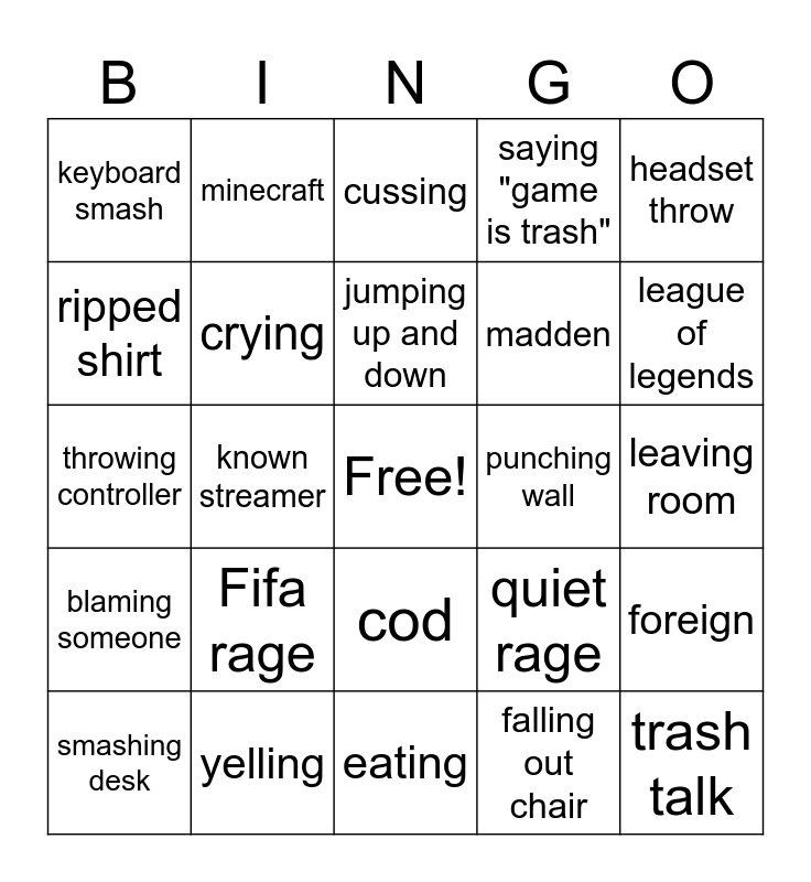 This bingo card has a free space and 24 words: Fifa rage, yelling, jumping up and down, smashing desk, headset throw, keyboard smash, ripped shirt, minecraft, punching wall, cod, madden, throwing controller, quiet rage, foreign, crying, falling out chair, leaving room, cussing, league of legends, known streamer, trash talk, blaming someone, saying "game is trash" and eating.