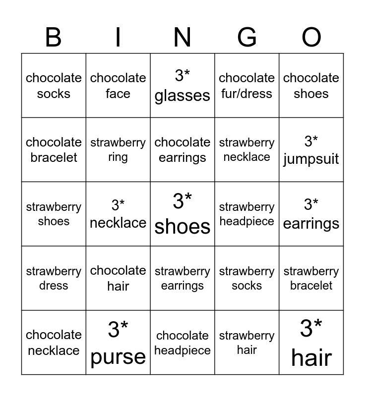 This bingo card has 25 words: chocolate hair, chocolate headpiece, chocolate earrings, chocolate necklace, chocolate shoes, chocolate socks, chocolate bracelet, chocolate face, strawberry headpiece, strawberry earrings, strawberry necklace, strawberry shoes, strawberry socks, strawberry bracelet, strawberry ring, 3* hair, 3* earrings, 3* glasses, 3* jumpsuit, 3* necklace, 3* shoes, 3* purse, strawberry dress, chocolate fur/dress and strawberry hair.