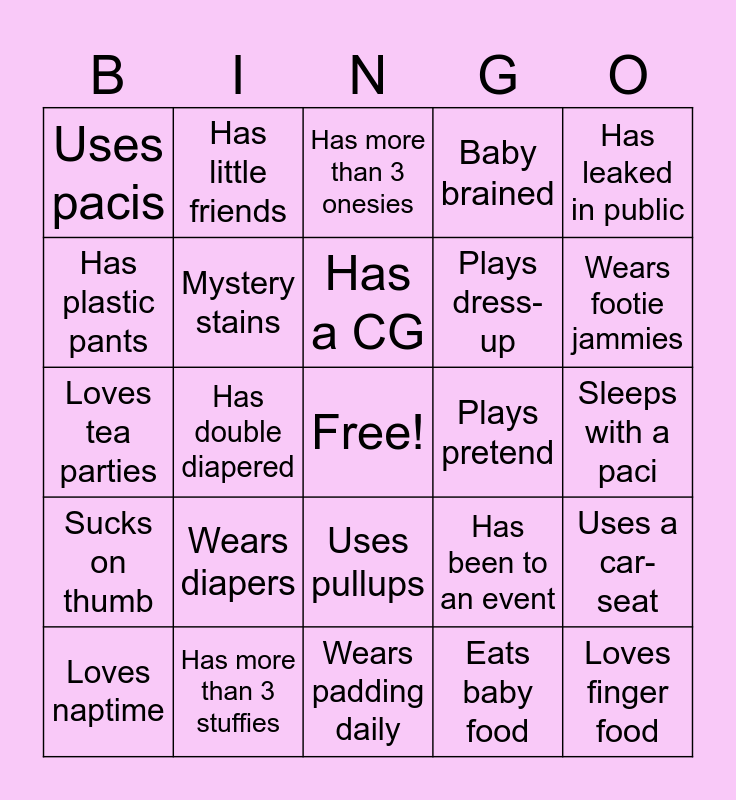 This bingo card has a free space and 24 words: Wears diapers, Has more than 3 stuffies, Has a CG, Loves naptime, Has leaked in public, Uses pacis, Has plastic pants, Has little friends, Plays pretend, Uses pullups, Plays dress-up, Loves tea parties, Has been to an event, Uses a car-seat, Mystery stains, Eats baby food, Sleeps with a paci, Has more than 3 onesies, Wears footie jammies, Has double diapered, Loves finger food, Sucks on thumb, Baby brained and Wears padding daily.