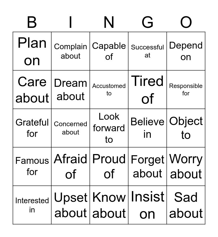 This bingo card has a free space and 24 words: Afraid of, Upset about, Accustomed to, Interested in, Depend on, Plan on, Care about, Complain about, Believe in, Proud of, Tired of, Grateful for, Forget about, Worry about, Dream about, Insist on, Object to, Capable of, Responsible for, Concerned about, Sad about, Famous for, Successful at and Know about.
