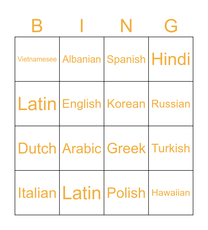 This bingo card has 28 words: Romanian, Hungarian, Dutch, German, English, Spanish, Albanian, Hawaiian, Latin, Thai, Greek, Hindi, Slovak, Croatian, Arabic, Japanese, French, Korean, Russian, Chinese, Vietnamesee, Portugese, Italian, Turkish, Polish, Swahili, Latin and Armanian.
