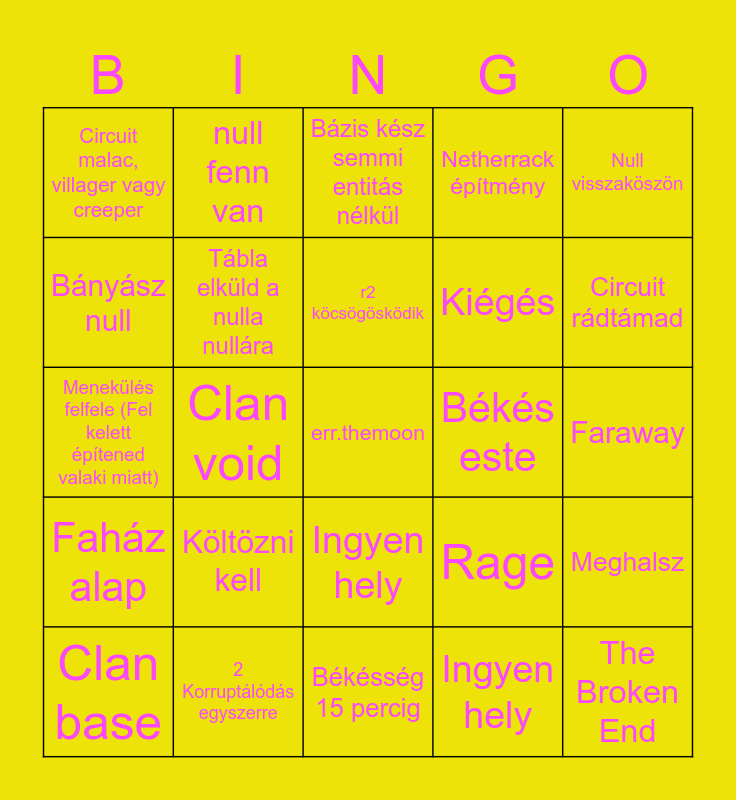 This bingo card has 26 words: Ingyen hely, Ingyen hely, r2 köcsögösködik, 2 Korruptálódás egyszerre, Null visszaköszön, Circuit malac, villager vagy creeper, Bányász null, null fenn van, Faraway, Rage, Kiégés, Menekülés felfele (Fel kelett építened valaki miatt), Meghalsz, Clan base, Clan void, "Hello" block, Netherrack építmény, Faház alap, Bázis kész semmi entitás nélkül, err.themoon, Circuit rádtámad, Békésség 15 percig, Békés este, Költözni kell, Tábla elküld a nulla nullára and The Broken End.