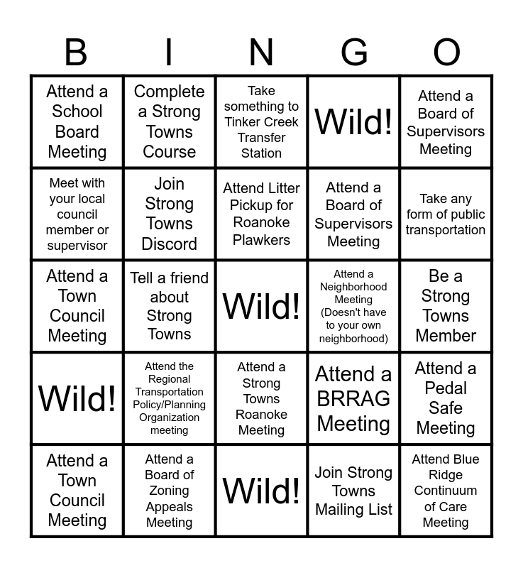 This bingo card has a free space and 24 words: Attend the Regional Transportation Policy/Planning Organization meeting, Attend a Board of Zoning Appeals Meeting, Attend Litter Pickup for Roanoke Plawkers, Attend a Town Council Meeting, Attend a Board of Supervisors Meeting, Attend a School Board Meeting, Meet with your local council member or supervisor, Complete a Strong Towns Course, Attend a Neighborhood Meeting (Doesn't have to your own neighborhood), Attend a Strong Towns Roanoke Meeting, Attend a Board of Supervisors Meeting, Attend a Town Council Meeting, Attend a BRRAG Meeting, Attend a Pedal Safe Meeting, Join Strong Towns Discord, Join Strong Towns Mailing List, Be a Strong Towns Member, Take something to Tinker Creek Transfer Station, Take any form of public transportation, Tell a friend about Strong Towns, Attend Blue Ridge Continuum of Care Meeting, Wild!, Wild! and Wild!.