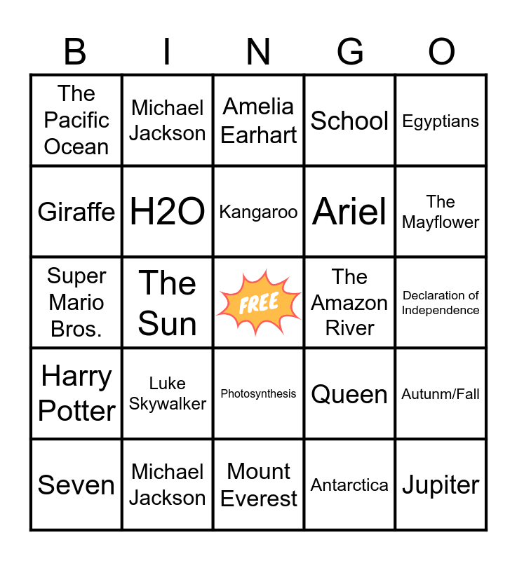 This bingo card has a free space and 30 words: Michael Jackson, Michelangelo, The Sun, Carbon Dioxide, The Pacific Ocean, Amelia Earhart, H2O, Photosynthesis, The Amazon River, Mount Everest, Declaration of Independence, Jupiter, Antarctica, South America, The Mayflower, Niagra Falls, Queen, Harry Potter, Luke Skywalker, Egyptians, Super Mario Bros., The Mona Lisa, Michael Jackson, Ariel, Giraffe, School, Autunm/Fall, Seven, Kangaroo and Elephant.