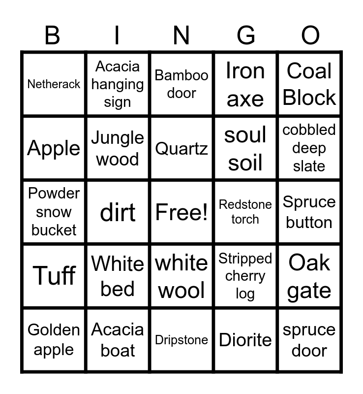 This bingo card has a free space and 24 words: Golden apple, White bed, Quartz, Diorite, Coal Block, Netherack, Acacia hanging sign, Bamboo door, Redstone torch, Spruce button, Powder snow bucket, Jungle wood, Stripped cherry log, Oak gate, Apple, Acacia boat, Dripstone, Iron axe, cobbled deep slate, Tuff, dirt, white wool, soul soil and spruce door.