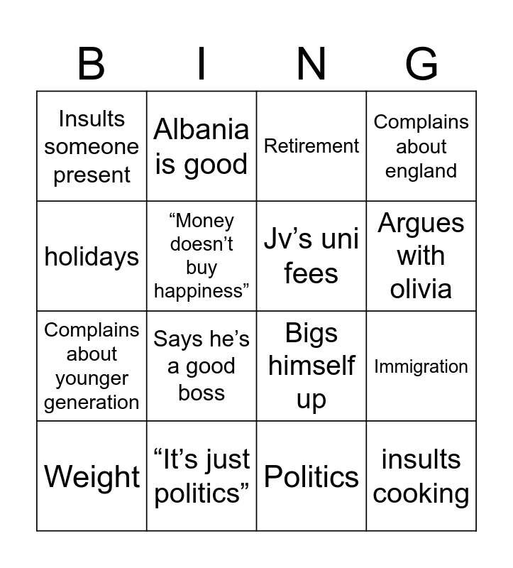 This bingo card has 16 words: “It’s just politics”, Immigration, Retirement, Insults someone present, Complains about younger generation, Albania is good, Bigs himself up, Politics, holidays, “Money doesn’t buy happiness”, Weight, Complains about england, Says he’s a good boss, Argues with olivia, Jv’s uni fees and insults cooking.