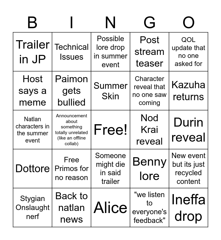 This bingo card has a free space and 24 words: Free Primos for no reason, Back to natlan news, Summer Skin, Stygian Onslaught nerf, QOL update that no one asked for, Trailer in JP, Host says a meme, Technical Issues, Nod Krai reveal, Someone might die in said trailer, Character reveal that no one saw coming, Natlan characters in the summer event, Benny lore, New event but its just recycled content, Paimon gets bullied, "we listen to everyone's feedback", Durin reveal, Possible lore drop in summer event, Kazuha returns, Announcement about something totally unrelated (like an offline collab), Ineffa drop, Dottore, Post stream teaser and Alice.