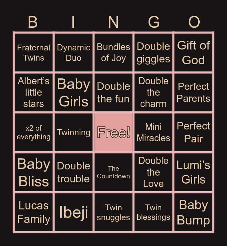 This bingo card has a free space and 24 words: Lucas Family, Double trouble, Double the fun, Twin blessings, Gift of God, Fraternal Twins, Dynamic Duo, Bundles of Joy, Mini Miracles, Perfect Pair, x2 of everything, Baby Girls, Double the Love, Lumi’s Girls, Albert’s little stars, Ibeji, Twin snuggles, Double giggles, Perfect Parents, Baby Bliss, Twinning, The Countdown, Double the charm and Baby Bump.