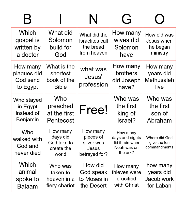 This bingo card has a free space and 49 words: What is the first book of the Bible, how many years did Jacob work for Laban, Who was Jesus' Mother, How did God speak to Moses in the Desert, How many days did God take to create the world, How many books of the Bible are there?, What did Solomon build for God, Where was Jesus Born, How many plagues did God send to Egypt, Who was the first man, What is the shortest book of the Bible, How many wives did Solomon have, Where did God give the ten commandments, How many days and nights did it rain when Noah was on the ark?, How many fruits of the spirit are there?, How many people saw Jesus after resurrection, what was Jesus' profession, Who was the first king of Israel?, What was God's sign to Noah?, How old was Jesus when he began ministry, Who preached at the first Pentecost, How many thieves were crucified with Christ, Which gospel is written by a doctor, How many brothers did Joseph have?, What is the longest prophetic book in the OT, How many years did Methusaleh live, Which animal spoke to Balaam, How many disciples did Jesus have, How many pieces of silver was Jesus betrayed for?, Who walked with God and never died, Who was thrown into the lions den?, Whose name was changed to Israel, Who was swallowed by a big fish, Who watched as Moses floated down the Nile, Who was taken to heaven in a fiery chariot, what is the last book in the Bible, What is the longest book in the Bible, Who built the ark, Who was the first son of Abraham, Who was Isaac's wife, Which son did Isaac favor, Who was Jacob tricked into marrying first, Who was Rachel's firstborn son, Where did the slavers take Joseph, Who stayed in Egypt instead of Benjamin, What did the Israelites call the bread from heaven, Who is the wisest man, Who betrayed Jesus and Who was the shepherd turned king of Israel.