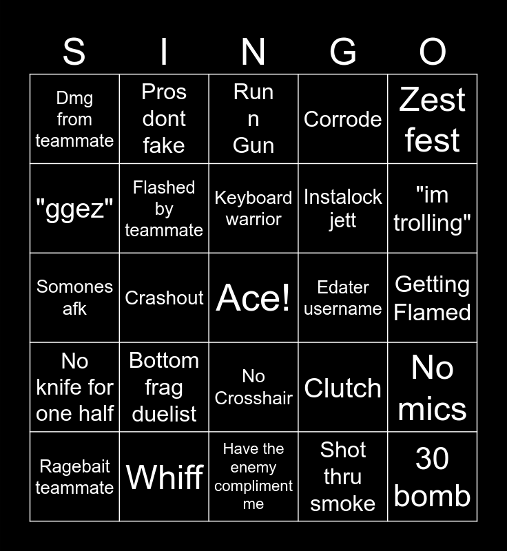 This bingo card has a free space and 24 words: Bottom frag duelist, Whiff, Keyboard warrior, Ragebait teammate, Zest fest, Dmg from teammate, "ggez", Pros dont fake, Edater username, No Crosshair, Instalock jett, Somones afk, Clutch, No mics, Flashed by teammate, Shot thru smoke, Getting Flamed, Run n Gun, "im trolling", Crashout, 30 bomb, No knife for one half, Corrode and Have the enemy compliment me.