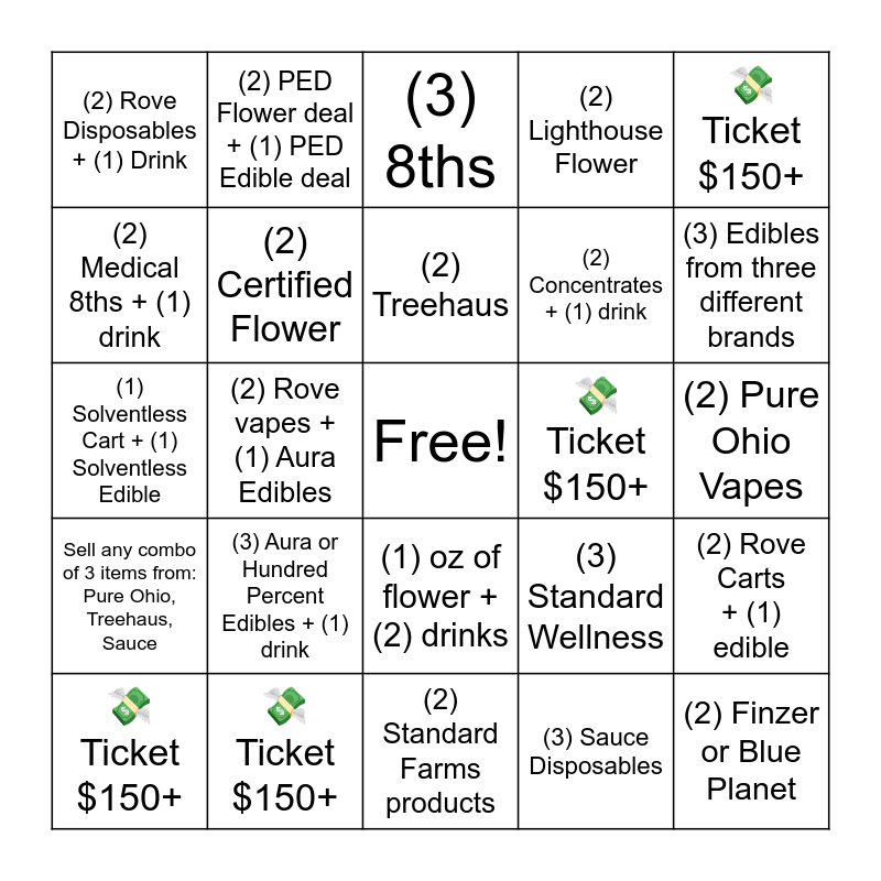 This bingo card has a free space and 24 words: 💸 Ticket $150+, (3) Aura or Hundred Percent Edibles + (1) drink, (2) Treehaus, (3) Sauce Disposables, 💸 Ticket $150+, (2) Rove Disposables + (1) Drink, (2) PED Flower deal + (1) PED Edible deal, (3) 8ths, 💸 Ticket $150+, (2) Pure Ohio Vapes, (1) Solventless Cart + (1) Solventless Edible, (2) Certified Flower, (3) Standard Wellness, (2) Rove Carts + (1) edible, (2) Medical 8ths + (1) drink, 💸 Ticket $150+, (2) Standard Farms products, (2) Lighthouse Flower, (3) Edibles from three different brands, Sell any combo of 3 items from: Pure Ohio, Treehaus, Sauce, (2) Rove vapes + (1) Aura Edibles, (1) oz of flower + (2) drinks, (2) Concentrates + (1) drink and (2) Finzer or Blue Planet.