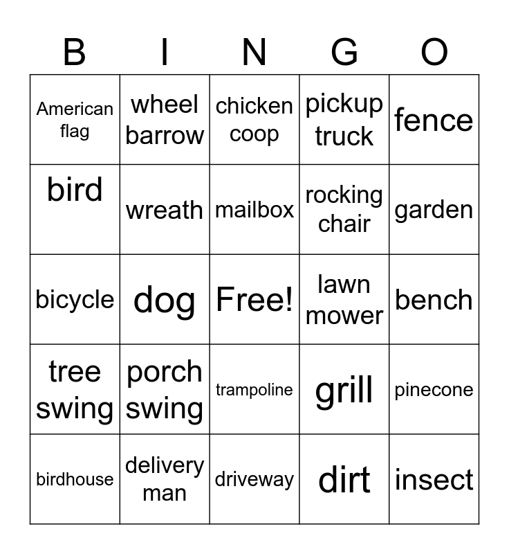 This bingo card has a free space and 24 words: porch swing, delivery man, mailbox, birdhouse, fence, American flag, bird, wheel barrow, lawn mower, trampoline, rocking chair, bicycle, grill, pinecone, wreath, dirt, bench, chicken coop, garden, dog, insect, tree swing, pickup truck and driveway.
