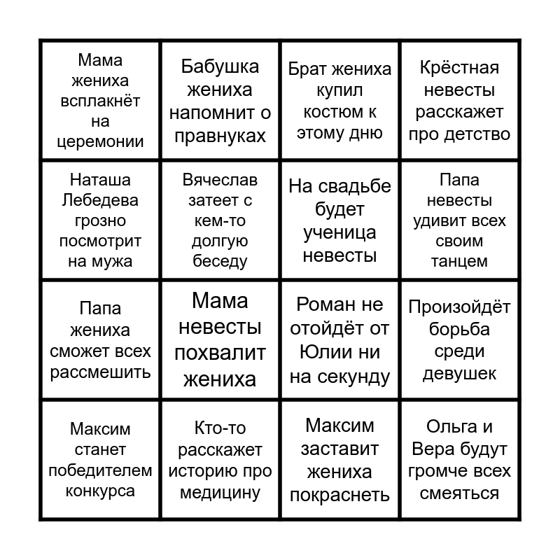 This bingo card has 16 words: Кто-то расскажет историю про медицину, Произойдёт борьба среди девушек, Брат жениха купил костюм к этому дню, Мама жениха всплакнёт на церемонии, Папа жениха сможет всех рассмешить, Бабушка жениха напомнит о правнуках, Роман не отойдёт от Юлии ни на секунду, Максим заставит жениха покраснеть, Наташа Лебедева грозно посмотрит на мужа, Вячеслав затеет с кем-то долгую беседу, Максим станет победителем конкурса, Крёстная невесты расскажет про детство, Мама невесты похвалит жениха, Папа невесты удивит всех своим танцем, На свадьбе будет ученица невесты and Ольга и Вера будут громче всех смеяться.