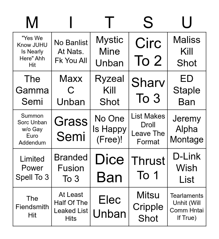 This bingo card has a free space and 24 words: Branded Fusion To 3, At Least Half Of The Leaked List Hits, Ryzeal Kill Shot, The Fiendsmith Hit, Maliss Kill Shot, "Yes We Know JUHU Is Nearly Here" Ahh Hit, The Gamma Semi, No Banlist At Nats. Fk You All, List Makes Droll Leave The Format, Dice Ban, Sharv To 3, Summon Sorc Unban w/o Gay Euro Addendum, Thrust To 1, D-Link Wish List, Maxx C Unban, Mitsu Cripple Shot, Jeremy Alpha Montage, Mystic Mine Unban, ED Staple Ban, Grass Semi, Tearlaments Unhit (Will Comm Hntai If True), Limited Power Spell To 3, Circ To 2 and Elec Unban.