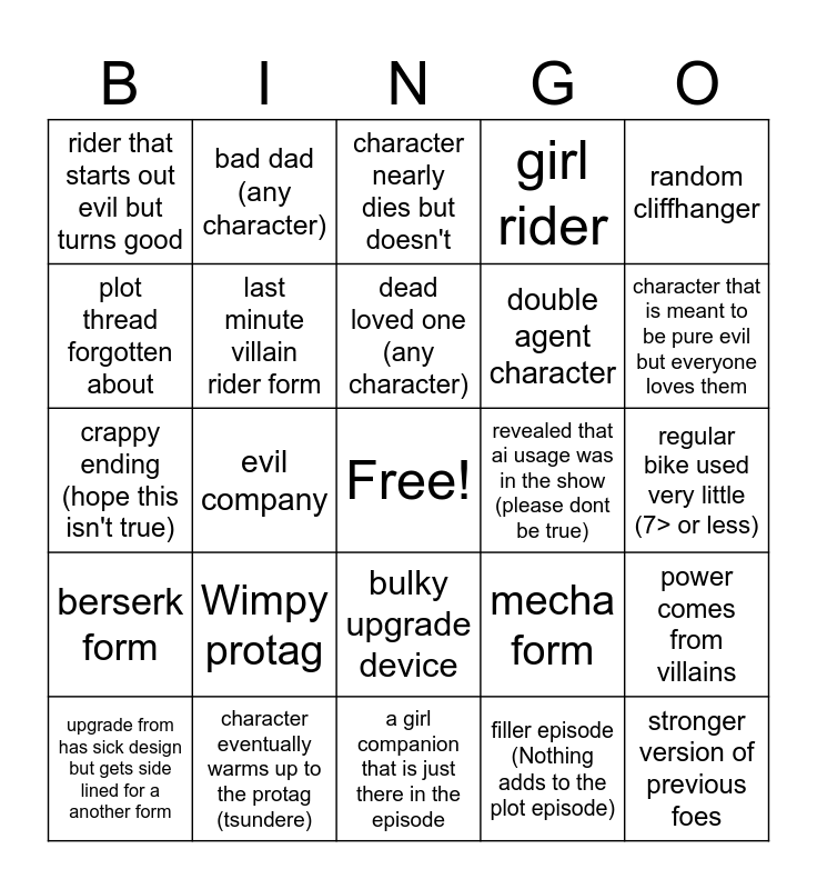 This bingo card has a free space and 24 words: Wimpy protag, character eventually warms up to the protag (tsundere), dead loved one (any character), upgrade from has sick design but gets side lined for a another form, random cliffhanger, rider that starts out evil but turns good, plot thread forgotten about, bad dad (any character), revealed that ai usage was in the show (please dont be true), bulky upgrade device, double agent character, crappy ending (hope this isn't true), mecha form, power comes from villains, last minute villain rider form, filler episode (Nothing adds to the plot episode), regular bike used very little (7> or less), character nearly dies but doesn't, character that is meant to be pure evil but everyone loves them, evil company, stronger version of previous foes, berserk form, girl rider and a girl companion that is just there in the episode.