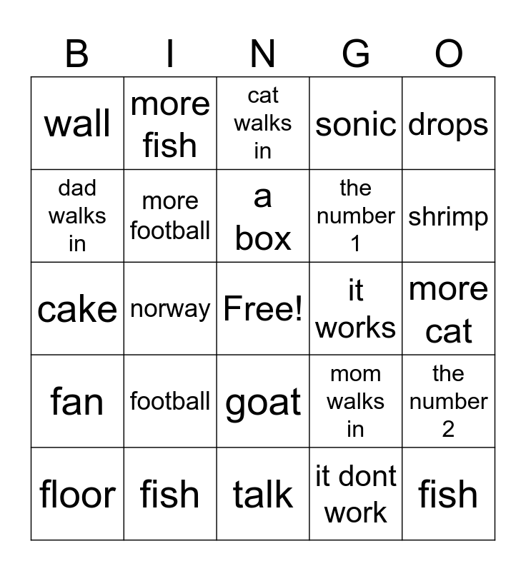 This bingo card has a free space and 24 words: football, fish, a box, floor, drops, wall, dad walks in, more fish, it works, goat, the number 1, cake, mom walks in, the number 2, more football, it dont work, more cat, cat walks in, shrimp, norway, fish, fan, sonic and talk.