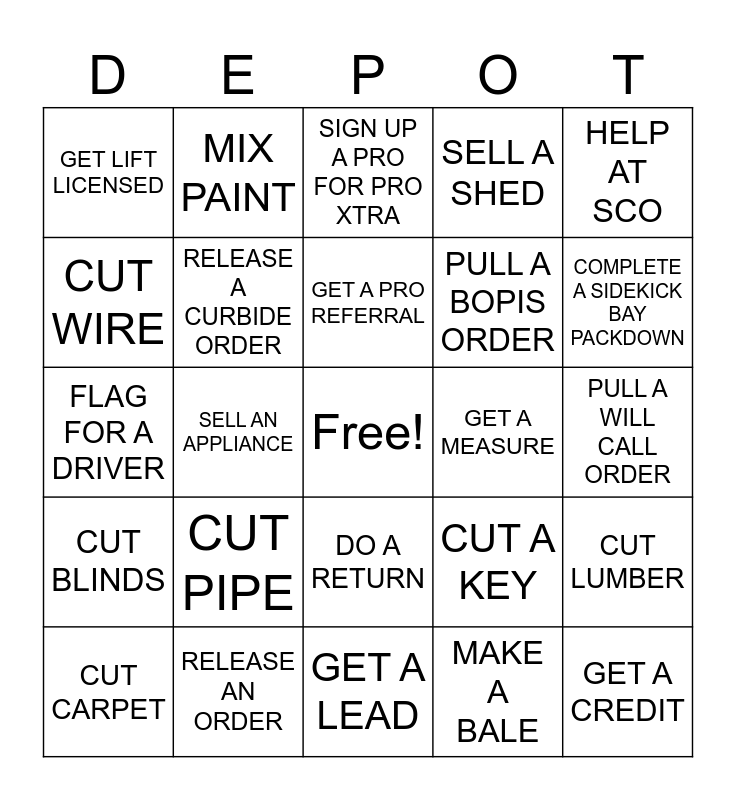 This bingo card has a free space and 24 words: CUT PIPE, RELEASE AN ORDER, GET A PRO REFERRAL, CUT CARPET, HELP AT SCO, GET LIFT LICENSED, CUT WIRE, MIX PAINT, GET A MEASURE, DO A RETURN, PULL A BOPIS ORDER, FLAG FOR A DRIVER, CUT A KEY, CUT LUMBER, RELEASE A CURBIDE ORDER, MAKE A BALE, PULL A WILL CALL ORDER, SIGN UP A PRO FOR PRO XTRA, COMPLETE A SIDEKICK BAY PACKDOWN, SELL AN APPLIANCE, GET A CREDIT, CUT BLINDS, SELL A SHED and GET A LEAD.