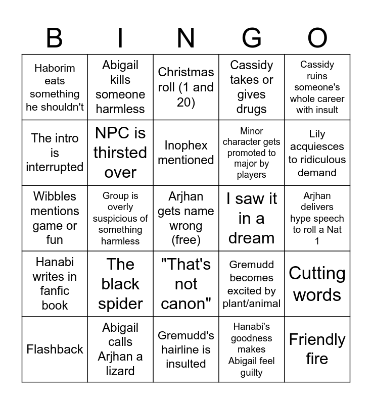 This bingo card has a free space and 24 words: The black spider, Abigail calls Arjhan a lizard, Inophex mentioned, Flashback, Cassidy ruins someone's whole career with insult, Haborim eats something he shouldn't, The intro is interrupted, Abigail kills someone harmless, I saw it in a dream, "That's not canon", Minor character gets promoted to major by players, Wibbles mentions game or fun, Gremudd becomes excited by plant/animal, Cutting words, NPC is thirsted over, Hanabi's goodness makes Abigail feel guilty, Arjhan delivers hype speech to roll a Nat 1, Christmas roll (1 and 20), Lily acquiesces to ridiculous demand, Group is overly suspicious of something harmless, Friendly fire, Hanabi writes in fanfic book, Cassidy takes or gives drugs and Gremudd's hairline is insulted.