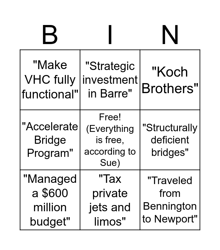 This bingo card has a free space and 8 words: "Structurally deficient bridges", "Koch Brothers", "Strategic investment in Barre", "Managed a $600 million budget", "Make VHC fully functional", "Traveled from Bennington to Newport", "Accelerate Bridge Program" and "Tax private jets and limos".