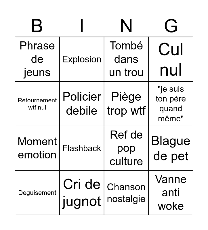 This bingo card has 16 words: Cri de jugnot, Blague de pet, Tombé dans un trou, Phrase de jeuns, Moment emotion, Explosion, Ref de pop culture, Chanson nostalgie, Retournement wtf nul, Policier debile, Deguisement, Cul nul, Flashback, "je suis ton père quand même", Piège trop wtf and Vanne anti woke.