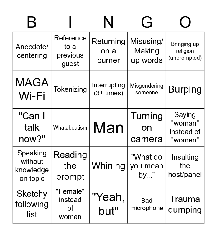 This bingo card has a free space and 24 words: Reading the prompt, "Female" instead of woman, Interrupting (3+ times), Sketchy following list, Bringing up religion (unprompted), Anecdote/ centering, MAGA Wi-Fi, Reference to a previous guest, Turning on camera, Whining, Misgendering someone, "Can I talk now?", "What do you mean by...", Insulting the host/panel, Tokenizing, Bad microphone, Saying "woman" instead of "women", Returning on a burner, Burping, Whataboutism, Trauma dumping, Speaking without knowledge on topic, Misusing/ Making up words and "Yeah, but".