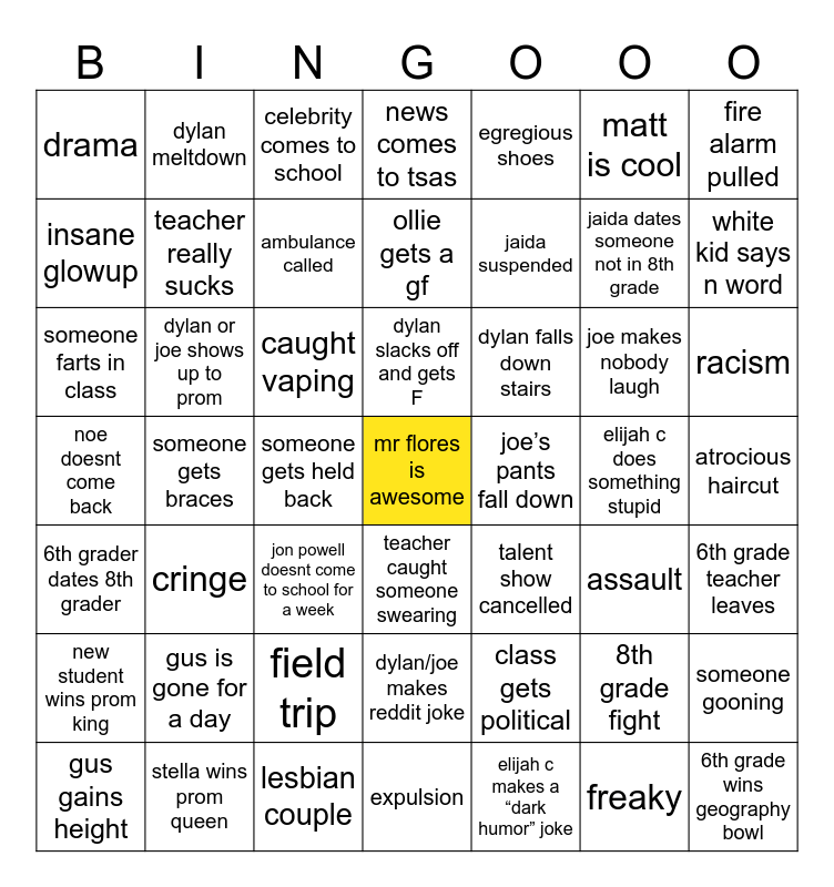 This bingo card has a free space and 48 words: class gets political, jaida dates someone not in 8th grade, expulsion, someone gets braces, caught vaping, atrocious haircut, dylan meltdown, stella wins prom queen, matt is cool, teacher caught someone swearing, fire alarm pulled, news comes to tsas, joe makes nobody laugh, dylan falls down stairs, new student wins prom king, elijah c does something stupid, insane glowup, white kid says n word, 8th grade fight, egregious shoes, jaida suspended, someone gets held back, drama, teacher really sucks, someone gooning, ambulance called, racism, gus gains height, dylan slacks off and gets F, dylan or joe shows up to prom, freaky, joe’s pants fall down, 6th grade teacher leaves, gus is gone for a day, noe doesnt come back, talent show cancelled, assault, someone farts in class, jon powell doesnt come to school for a week, field trip, 6th grader dates 8th grader, 6th grade wins geography bowl, celebrity comes to school, lesbian couple, ollie gets a gf, dylan/joe makes reddit joke, cringe and elijah c makes a “dark humor” joke.