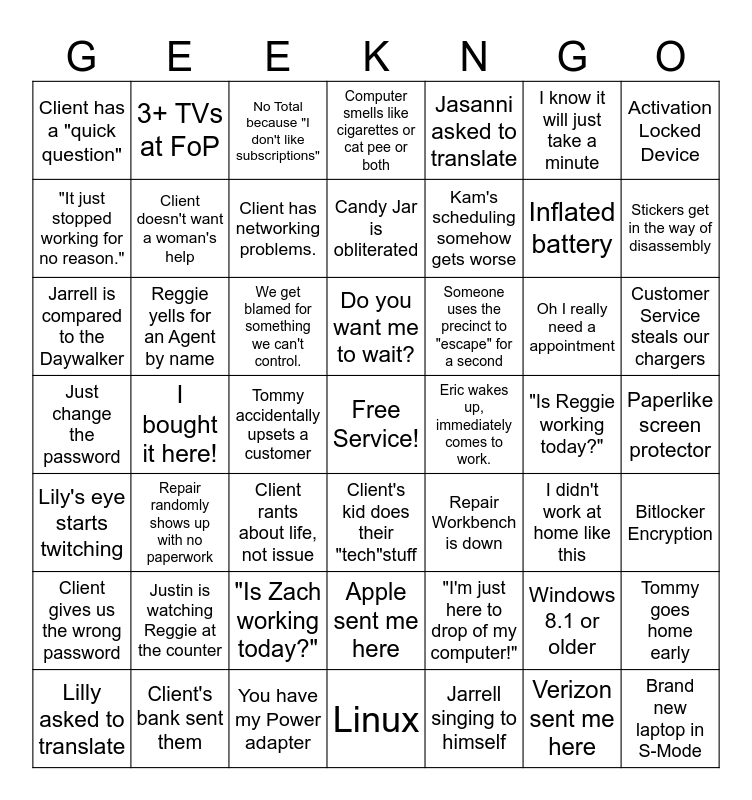 This bingo card has a free space and 48 words: "I'm just here to drop of my computer!", Inflated battery, Linux, I bought it here!, We get blamed for something we can't control., Paperlike screen protector, 3+ TVs at FoP, Client's bank sent them, I know it will just take a minute, Client's kid does their "tech"stuff, Activation Locked Device, Computer smells like cigarettes or cat pee or both, Oh I really need a appointment, Someone uses the precinct to "escape" for a second, Client gives us the wrong password, "Is Reggie working today?", "It just stopped working for no reason.", Stickers get in the way of disassembly, Windows 8.1 or older, Jasanni asked to translate, Kam's scheduling somehow gets worse, Tommy accidentally upsets a customer, Client has a "quick question", Client doesn't want a woman's help, Tommy goes home early, Client has networking problems., Customer Service steals our chargers, Lilly asked to translate, Do you want me to wait?, Reggie yells for an Agent by name, Verizon sent me here, Eric wakes up, immediately comes to work., Bitlocker Encryption, Justin is watching Reggie at the counter, Just change the password, Repair Workbench is down, I didn't work at home like this, Jarrell is compared to the Daywalker, Client rants about life, not issue, "Is Zach working today?", Lily's eye starts twitching, Brand new laptop in S-Mode, No Total because "I don't like subscriptions", You have my Power adapter, Candy Jar is obliterated, Apple sent me here, Repair randomly shows up with no paperwork and Jarrell singing to himself.