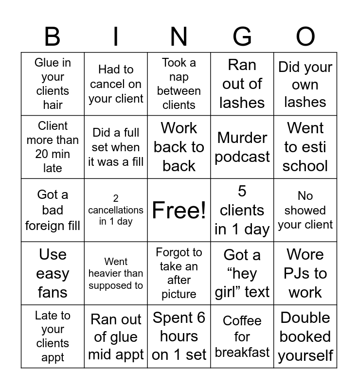 This bingo card has a free space and 29 words: Late to your clients appt, No call/no showed, 2 cancellations in 1 day, Dropped your tweezers, Glue in your clients hair, Took a nap between clients, Did a full set when it was a fill, Went heavier than supposed to, 5 clients in 1 day, Ran out of glue mid appt, No showed your client, Double booked yourself, Spent 6 hours on 1 set, Coffee for breakfast, Went to esti school, Considered giving up, Forgot to take an after picture, Use easy fans, Did your own lashes, Got a bad foreign fill, Got a “hey girl” text, FREE, Murder podcast, Client more than 20 min late, Ran out of lashes, Had to cancel on your client, Wore PJs to work, Work back to back and Broke your fav pair of tweezers.