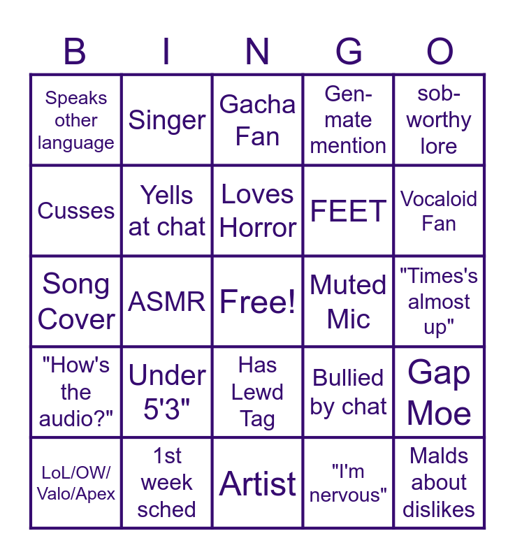 This bingo card has a free space and 29 words: LoL/OW/ Valo/Apex, British, ASMR, Fangs, Speaks other language, Gacha Fan, Yells at chat, Under 5'3", Muted Mic, 1st week sched, "Times's almost up", Malds about dislikes, Artist, "I'm nervous", Vocaloid Fan, SCUFF, Has Lewd Tag, "How's the audio?", sob-worthy lore, Song Cover, Bullied by chat, 1st Week Collab, FEET, Cusses, Gen-mate mention, Singer, Gap Moe, Loves Horror and Has a hot take.