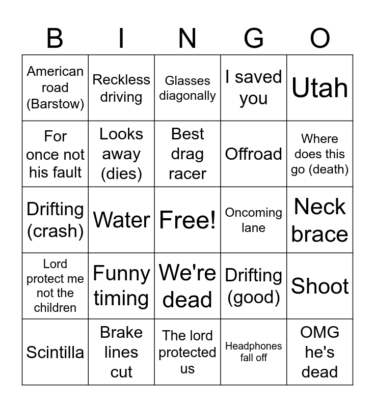 This bingo card has a free space and 24 words: Funny timing, Brake lines cut, Best drag racer, Scintilla, Utah, American road (Barstow), For once not his fault, Reckless driving, Oncoming lane, We're dead, Offroad, Drifting (crash), Drifting (good), Shoot, Looks away (dies), Headphones fall off, Neck brace, Glasses diagonally, Where does this go (death), Water, OMG he's dead, Lord protect me not the children, I saved you and The lord protected us.