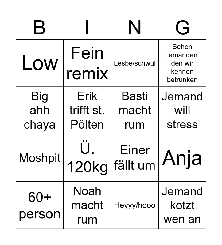 This bingo card has 16 words: Noah macht rum, Anja, Lesbe/schwul, Low, Moshpit, Fein remix, Einer fällt um, Heyyy/hooo, Big ahh chaya, Erik trifft st. Pölten, 60+ person, Sehen jemanden den wir kennen betrunken, Ü. 120kg, Jemand will stress, Basti macht rum and Jemand kotzt wen an.