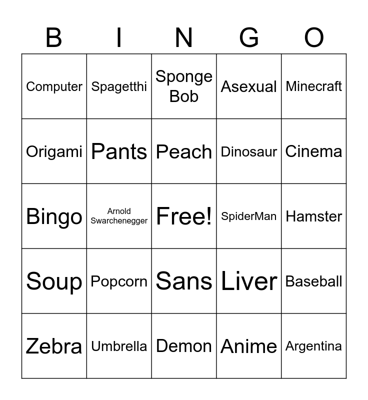 This bingo card has a free space and 24 words: Popcorn, Umbrella, Peach, Zebra, Minecraft, Computer, Origami, Spagetthi, SpiderMan, Sans, Dinosaur, Bingo, Liver, Baseball, Pants, Anime, Hamster, Sponge Bob, Cinema, Arnold Swarchenegger, Argentina, Soup, Asexual and Demon.