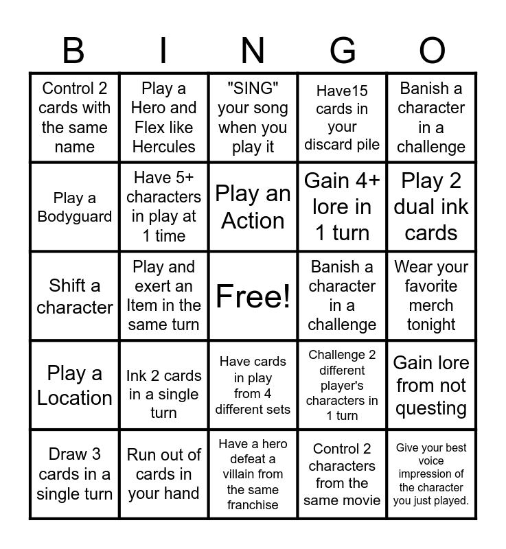 This bingo card has a free space and 24 words: Draw 3 cards in a single turn, Ink 2 cards in a single turn, Play an Action, Control 2 characters from the same movie, Banish a character in a challenge, Control 2 cards with the same name, Play a Hero and Flex like Hercules, "SING" your song when you play it, Banish a character in a challenge, Wear your favorite merch tonight, Shift a character, Have 5+ characters in play at 1 time, Challenge 2 different player's characters in 1 turn, Gain lore from not questing, Play a Bodyguard, Run out of cards in your hand, Have a hero defeat a villain from the same franchise, Have15 cards in your discard pile, Play 2 dual ink cards, Play a Location, Play and exert an Item in the same turn, Have cards in play from 4 different sets, Gain 4+ lore in 1 turn and Give your best voice impression of the character you just played..