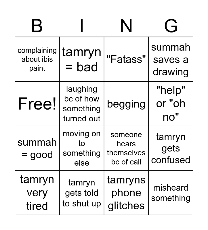 This bingo card has 16 words: tamryn gets told to shut up, tamryn gets confused, "Fatass", complaining about ibis paint, summah = good, tamryn = bad, someone hears themselves bc of call, tamryns phone glitches, Free!, laughing bc of how something turned out, tamryn very tired, summah saves a drawing, moving on to something else, "help" or "oh no", begging and misheard something.