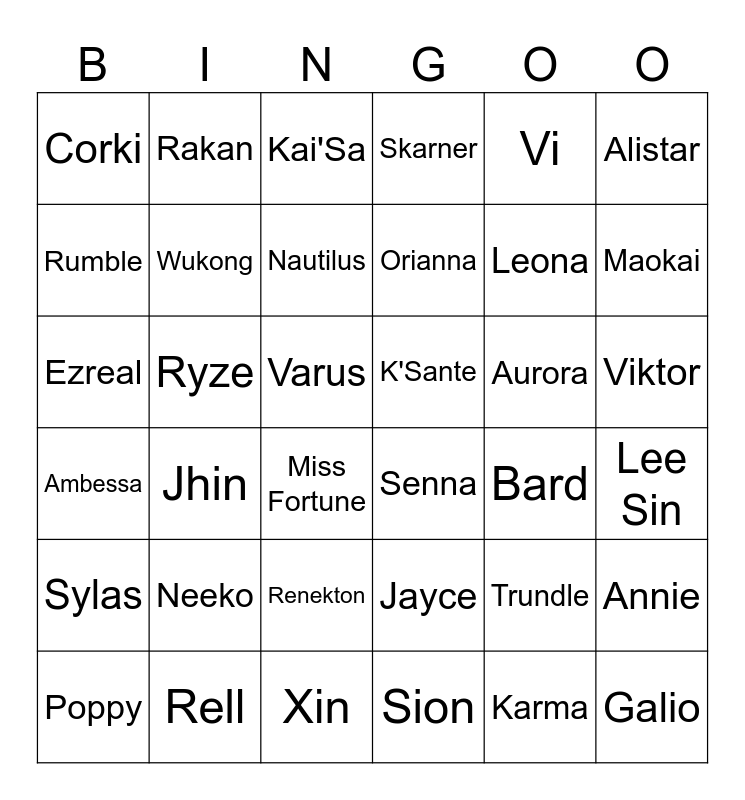This bingo card has 36 words: Jayce, Renekton, Sion, Rumble, Ambessa, K'Sante, Wukong, Xin, Vi, Trundle, Maokai, Skarner, Annie, Ryze, Orianna, Corki, Sylas, Aurora, Ezreal, Kai'Sa, Varus, Jhin, Senna, Miss Fortune, Bard, Rakan, Leona, Rell, Nautilus, Alistar, Galio, Poppy, Lee Sin, Viktor, Neeko and Karma.