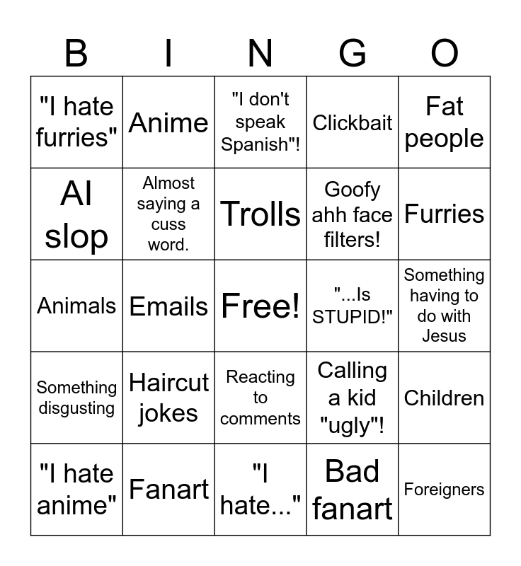 This bingo card has a free space and 24 words: "I hate anime", Haircut jokes, Trolls, Bad fanart, Fat people, "I hate furries", Anime, "I don't speak Spanish"!, "...Is STUPID!", Something having to do with Jesus, Animals, Almost saying a cuss word., Calling a kid "ugly"!, Children, AI slop, Fanart, "I hate...", Clickbait, Furries, Something disgusting, Emails, Reacting to comments, Goofy ahh face filters! and Foreigners.