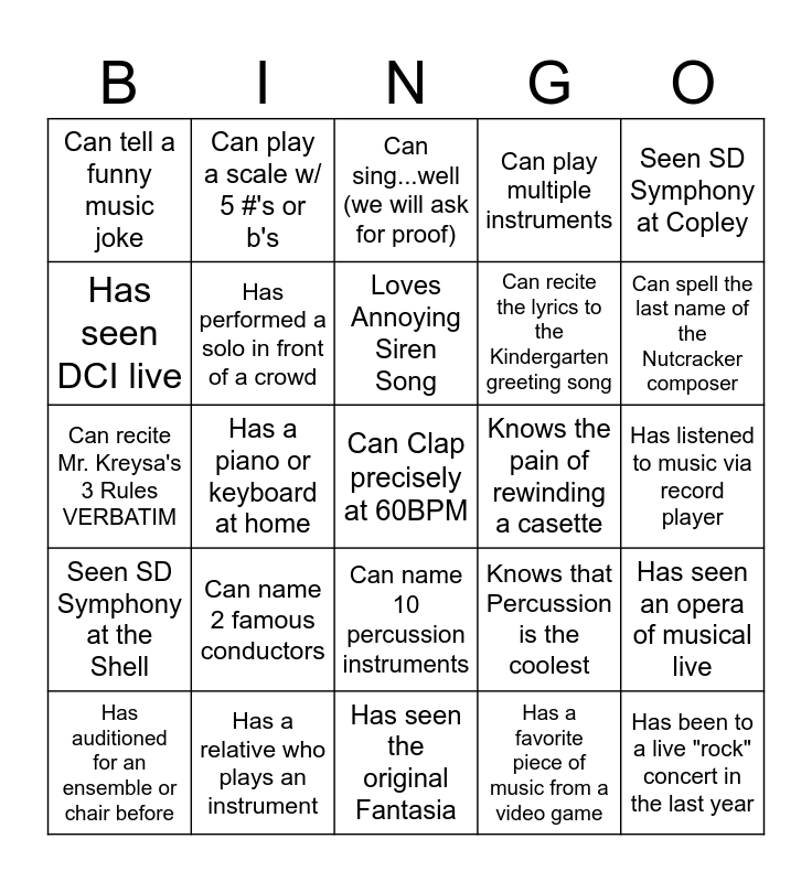 This bingo card has 25 words: Can name 2 famous conductors, Has seen the original Fantasia, Loves Annoying Siren Song, Has auditioned for an ensemble or chair before, Seen SD Symphony at Copley, Can tell a funny music joke, Has seen DCI live, Can play a scale w/ 5 #'s or b's, Knows the pain of rewinding a casette, Can name 10 percussion instruments, Can recite the lyrics to the Kindergarten greeting song, Can recite Mr. Kreysa's 3 Rules VERBATIM, Knows that Percussion is the coolest, Has seen an opera of musical live, Has performed a solo in front of a crowd, Has been to a live "rock" concert in the last year, Has listened to music via record player, Can sing...well (we will ask for proof), Can spell the last name of the Nutcracker composer, Has a piano or keyboard at home, Can Clap precisely at 60BPM, Has a relative who plays an instrument, Seen SD Symphony at the Shell, Can play multiple instruments and Has a favorite piece of music from a video game.