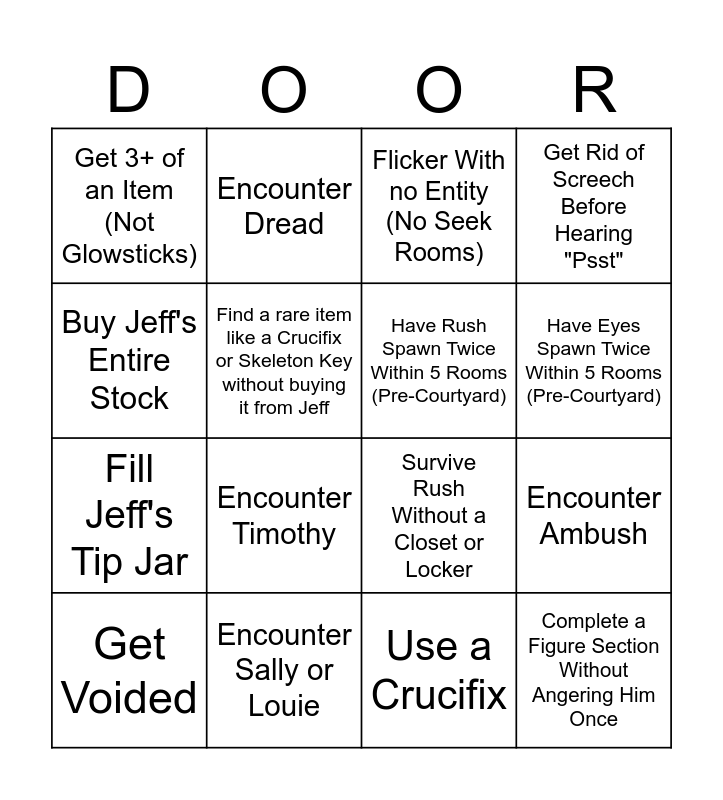 This bingo card has 16 words: Encounter Sally or Louie, Encounter Ambush, Flicker With no Entity (No Seek Rooms), Get 3+ of an Item (Not Glowsticks), Fill Jeff's Tip Jar, Encounter Dread, Survive Rush Without a Closet or Locker, Use a Crucifix, Buy Jeff's Entire Stock, Find a rare item like a Crucifix or Skeleton Key without buying it from Jeff, Get Voided, Get Rid of Screech Before Hearing "Psst", Encounter Timothy, Have Eyes Spawn Twice Within 5 Rooms (Pre-Courtyard), Have Rush Spawn Twice Within 5 Rooms (Pre-Courtyard) and Complete a Figure Section Without Angering Him Once.